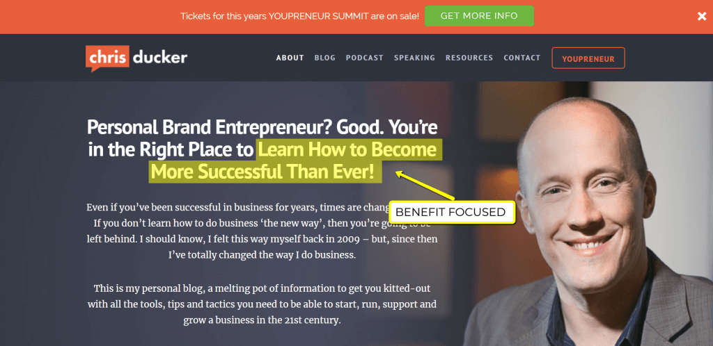 They’ve already clicked on your ‘about me’ link so why do you need to remind them again? Instead, use this as an opportunity to hook them right away with a benefit focused title.