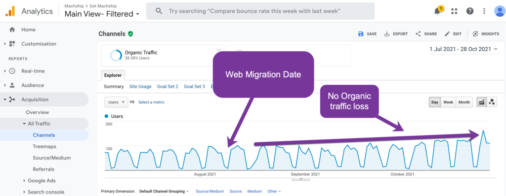 Implementing our web migration services following the completion of the pre-migration phase showed great results in preserving MachShip’s existing organic traffic. In fact, the site’s organic traffic increased following the migration as closely monitored the results during the post-migration phase.