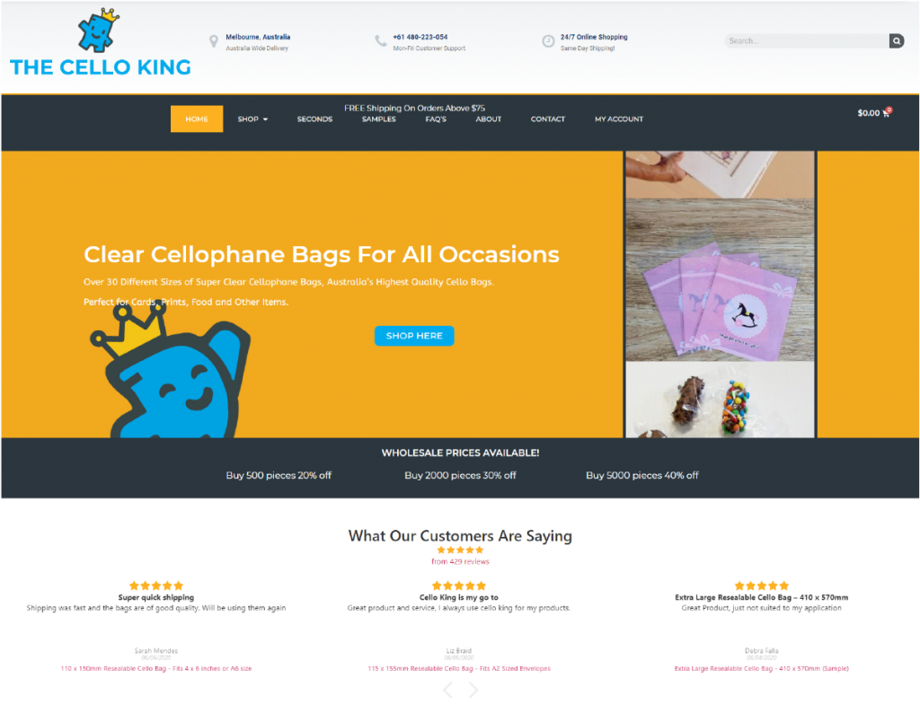 The Cello King is Australia’s leading small packaging company supplying packaging materials including cellophane bags for card makers and baked good supplies. The store launched online in early 2019 and trades exclusively to the Australian market.
