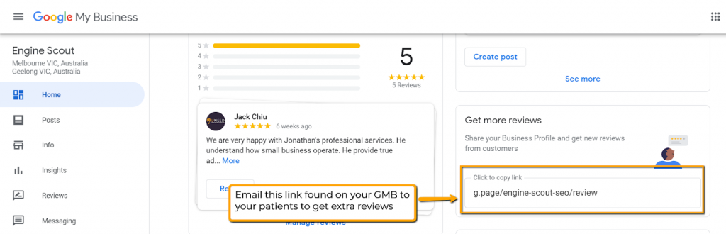 An easy way to get Google reviews is to have an automated email sent to existing patients and ask them if they would mind leaving a review. Google makes this super easy by giving you a link straight to your review page that you can send to customers.