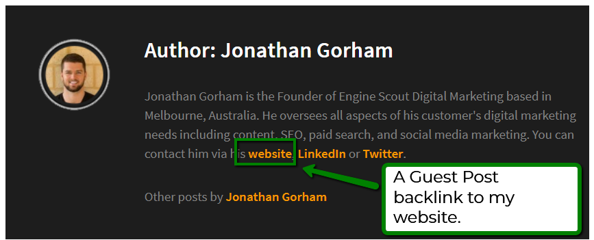 Here’s an example of a Guest post I wrote linking back to my own website: