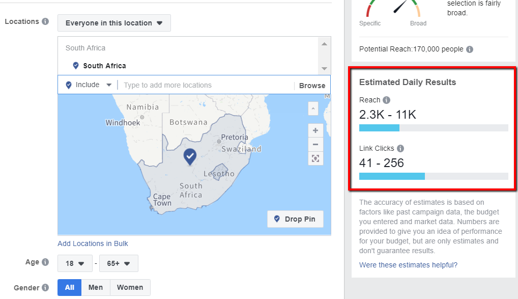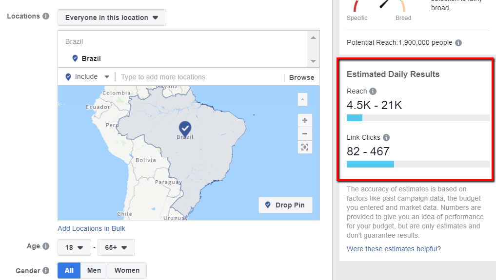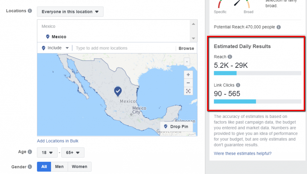 Location impacts price: Here’s a comparison of an ad with a $10 budget and with the same targeting set-up, just different locations.