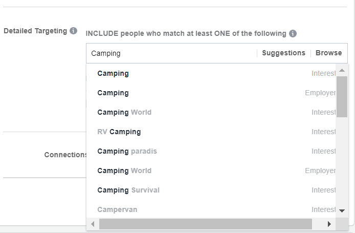 Facebook only shows you 25 similar interests related to the keyword “camping” meaning you’ll be fighting for the same ad space as everybody else in the camping niche.