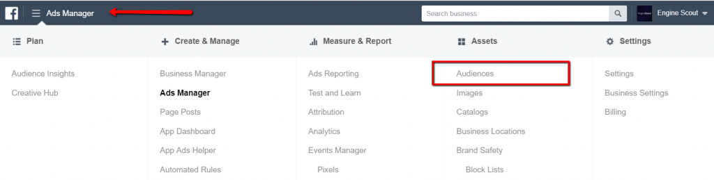 You’ll find audiences in the drop-down menu when you click on Business Manager at the top left-hand side of the screen.