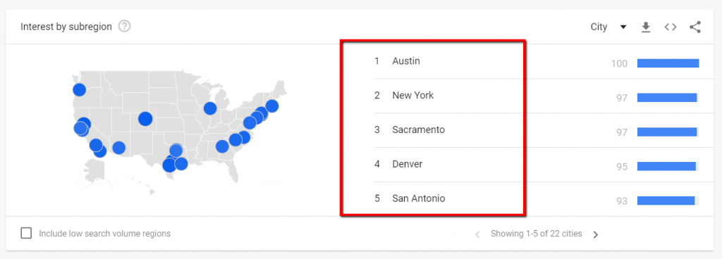 Not only is Google trends great for geotargeting but…you can also use it to find new audiences because it shows you related topics to your keyword.