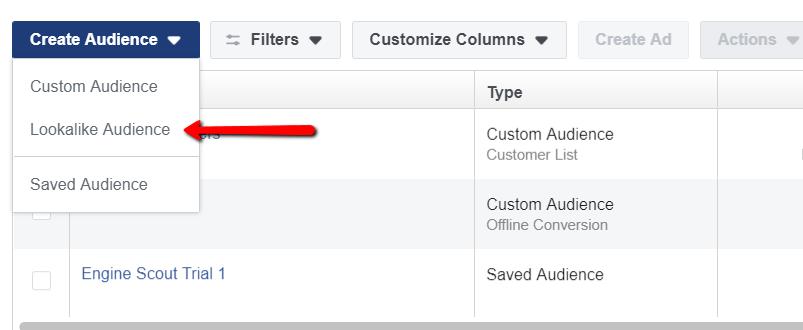 Step 2: Click on Create Audience and Select Lookalike Audience