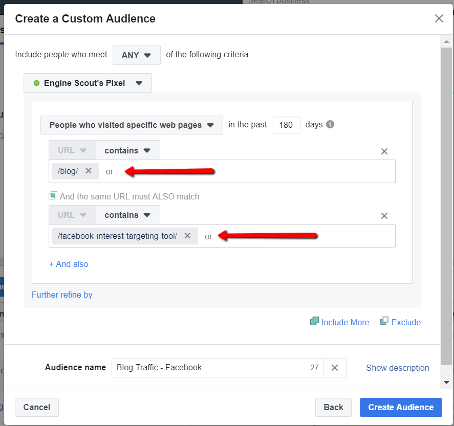 You can see from the image above I’m targeting website visitors who’ve visited my blog AND my Facebook tool. I know that these people are engaged with my site’s content.