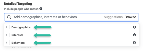 Remember: If you’re using any of the Detailed targeting features try to keep it broad and let Facebook’s powerful machine learning find your audience. If anything you can set up a separate ad set to be more targeted and test the performance versus broader audiences.