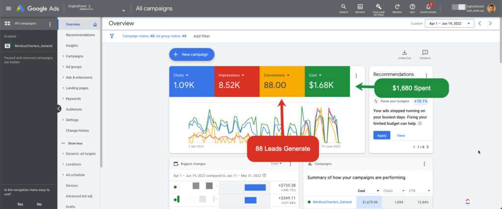 There are a lot of metrics available to measure the performance of paid ads and depending on your goals, some KPI’s will be more important than others. If you are focused on leads and sales then conversion rates and the number of conversions will be your most important KPI along with cost per click (CPC), Impression share, click-through rates and top-of-page rates. As part of our service, Engine Scout will provide you with all the important metrics for tracking performance.